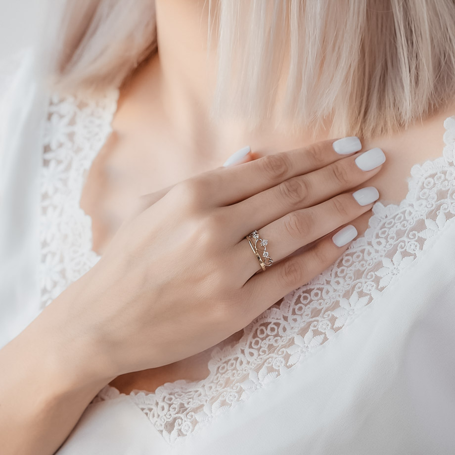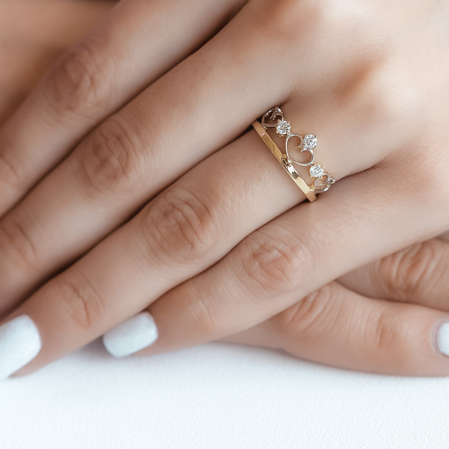 Precioso Anillo Corona Oro Doncella de cuerpo ligero con tres hermosas zirconias que dan unión y brillo a las siluetas de corazón, con un acabado liso para todo cuerpo.