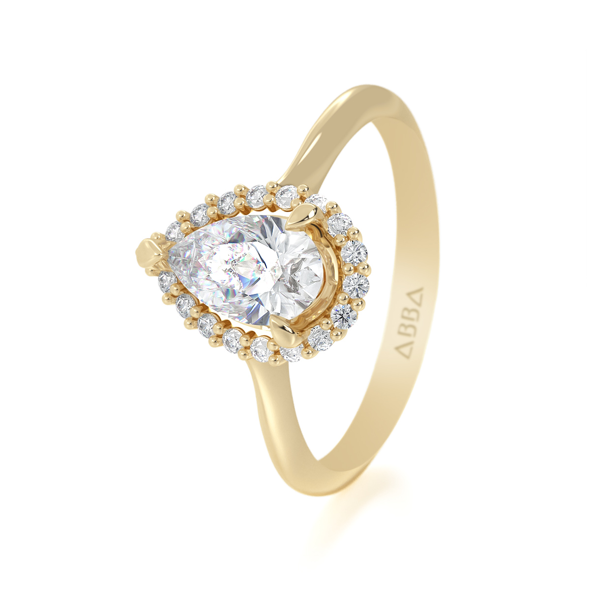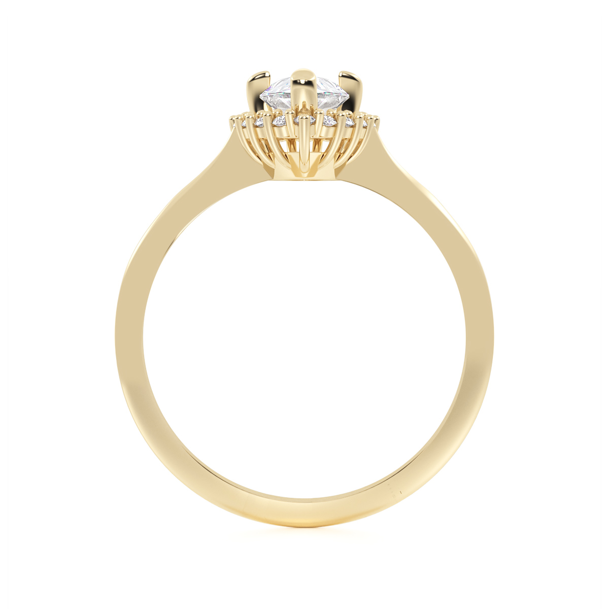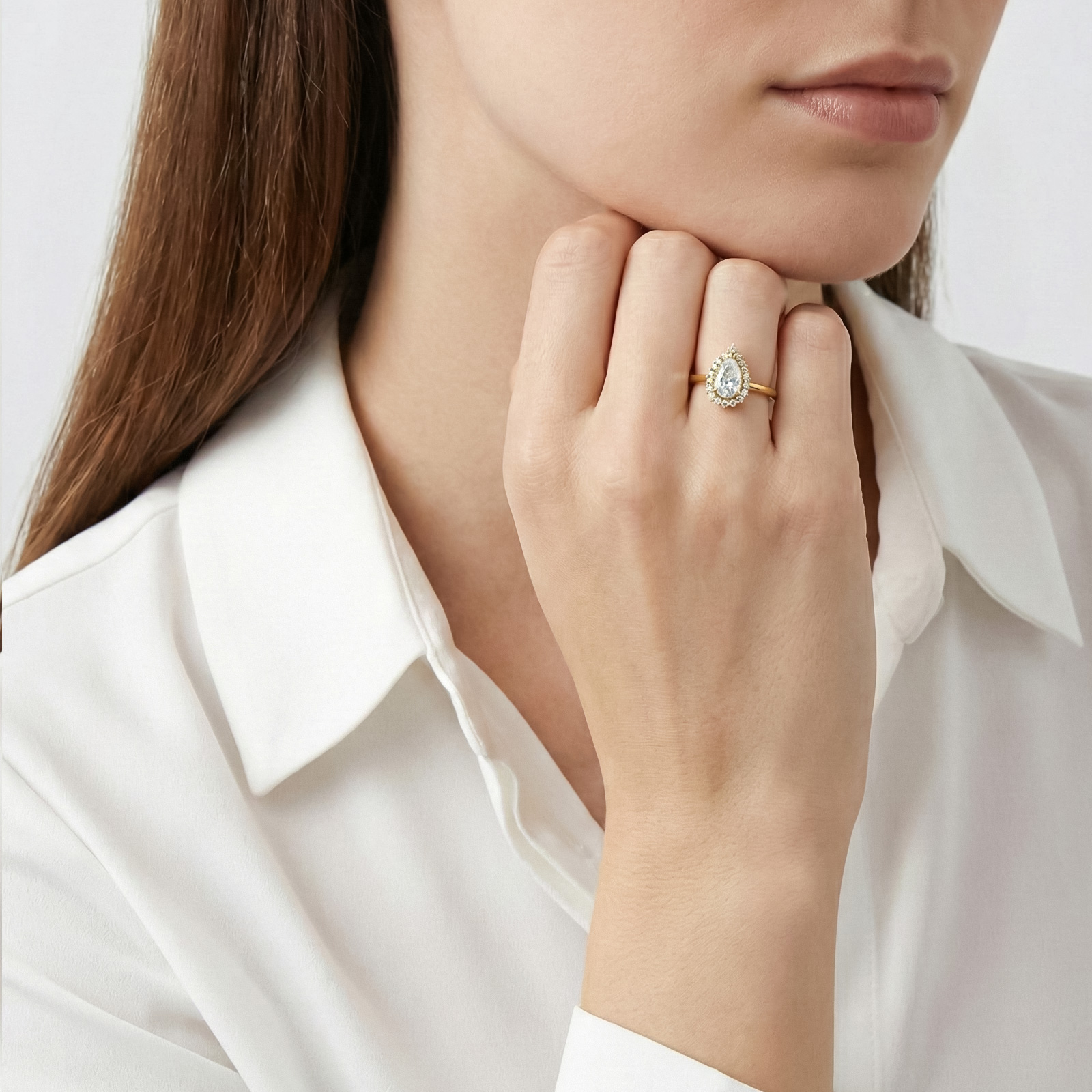 Elegante Anillo de Compromiso Oro Valentina es una joya de estilo clásico y refinado, diseñada para destacar la belleza de su gema central corte gota, rodeada de un halo de gemas que intensifican su brillo y presencia.