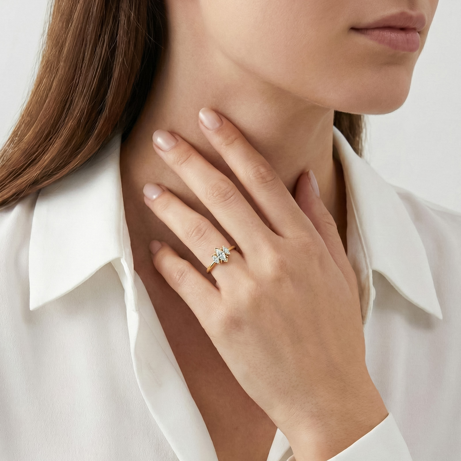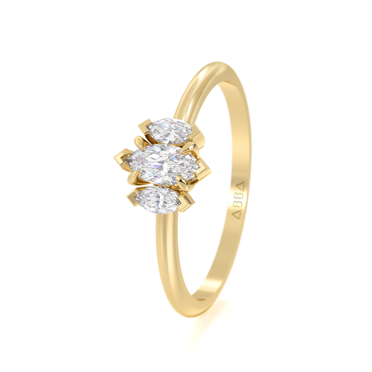 Brillante Anillo de Dama Oro Livia es una joya de estilo refinado y romántico, diseñada para destacar la belleza de su gema central corte marquiz, acompañada por gemas laterales que aportan profundidad y un brillo excepcional.