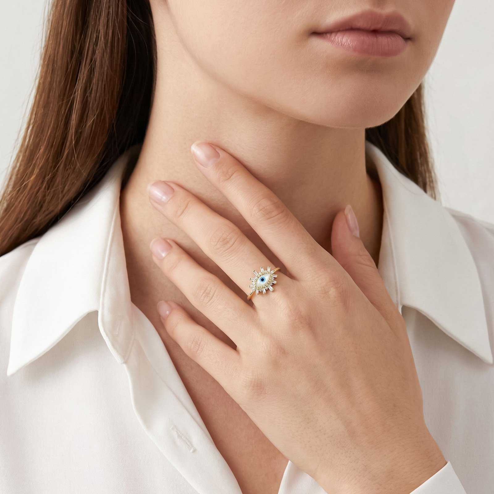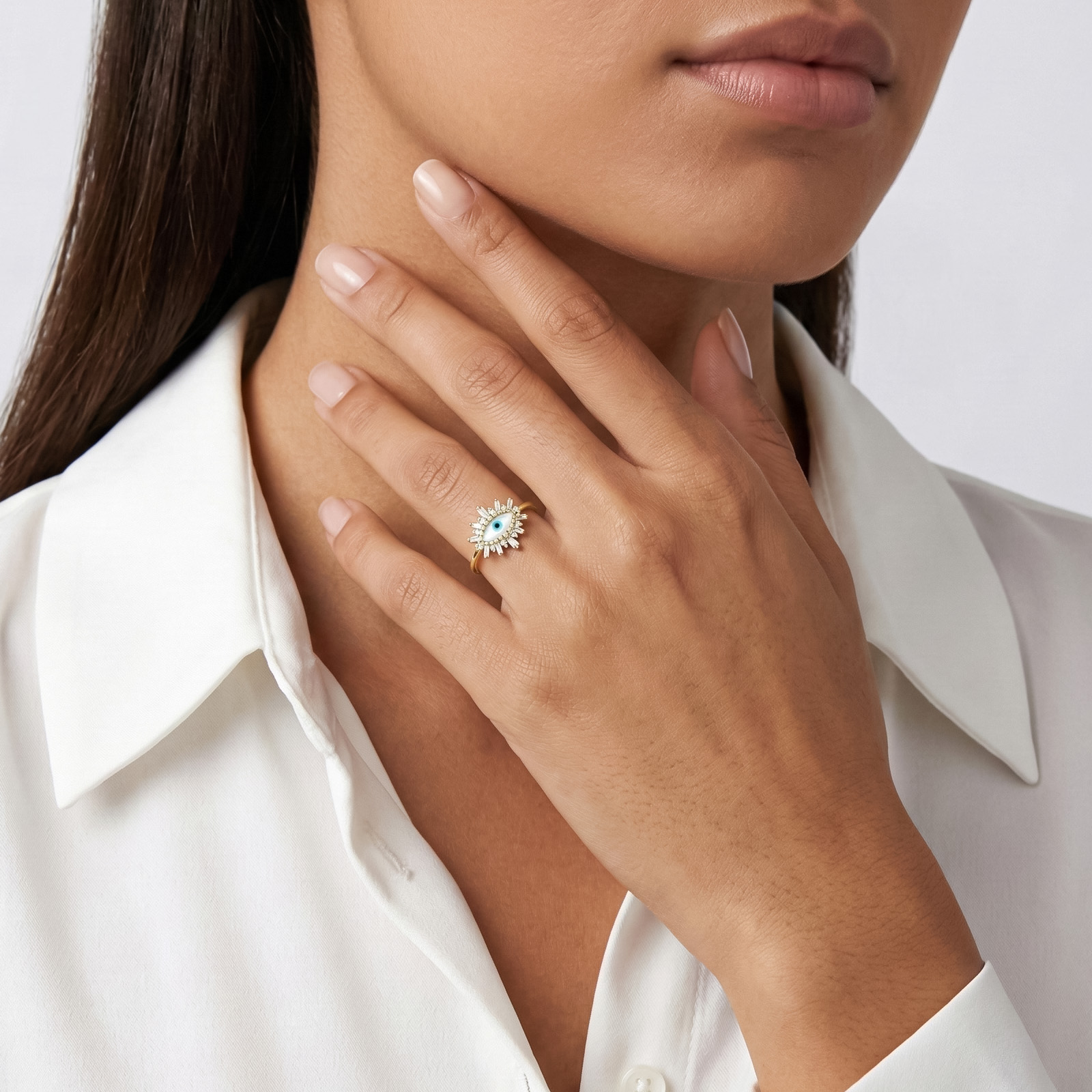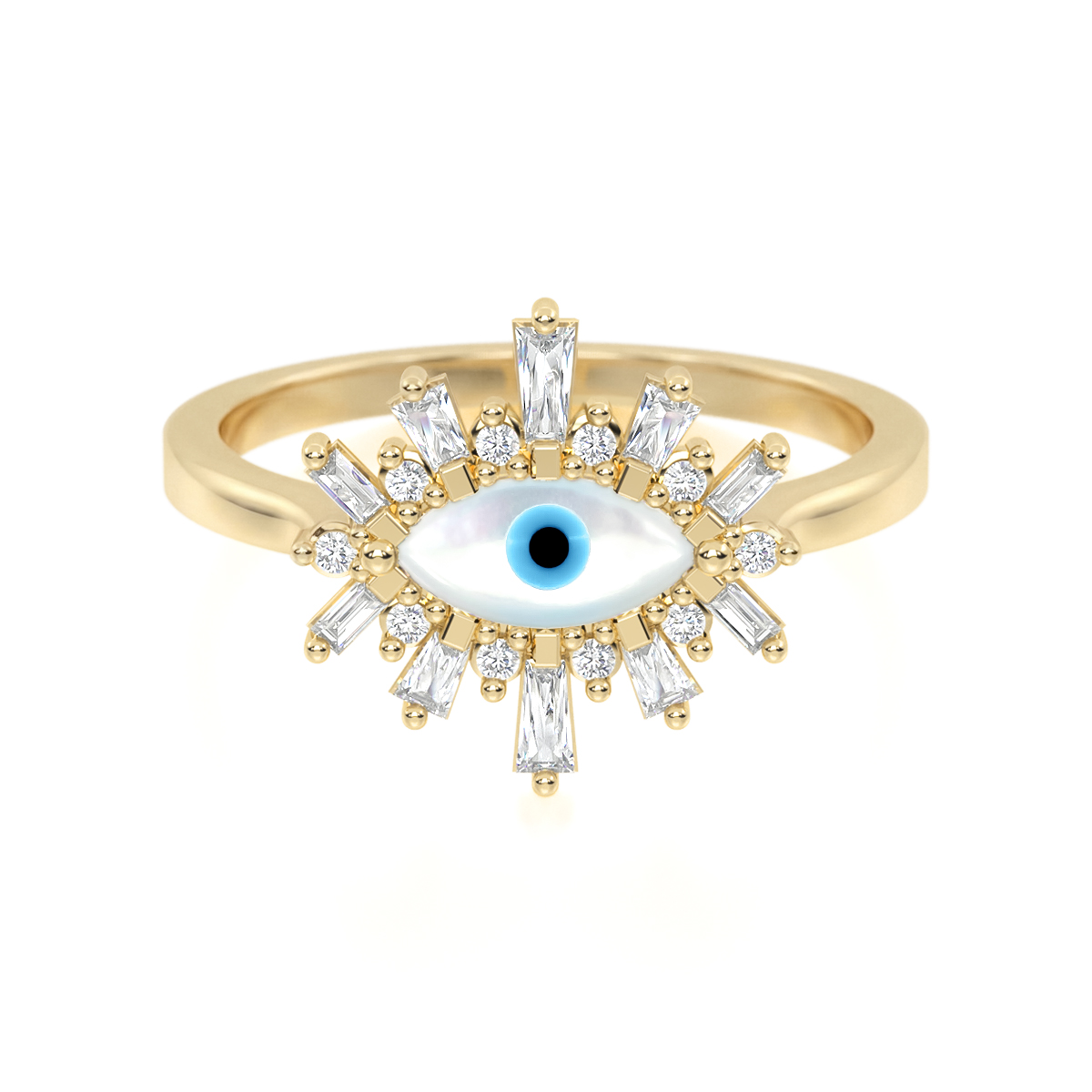 Sofisticado Anillo de Oro Nazar Madreperla Ojo Turco es una joya única que combina elegancia y significado. Su diseño de ojo protector con madreperla al centro se realza con delicadas gemas que crean un brillo armonioso y moderno.