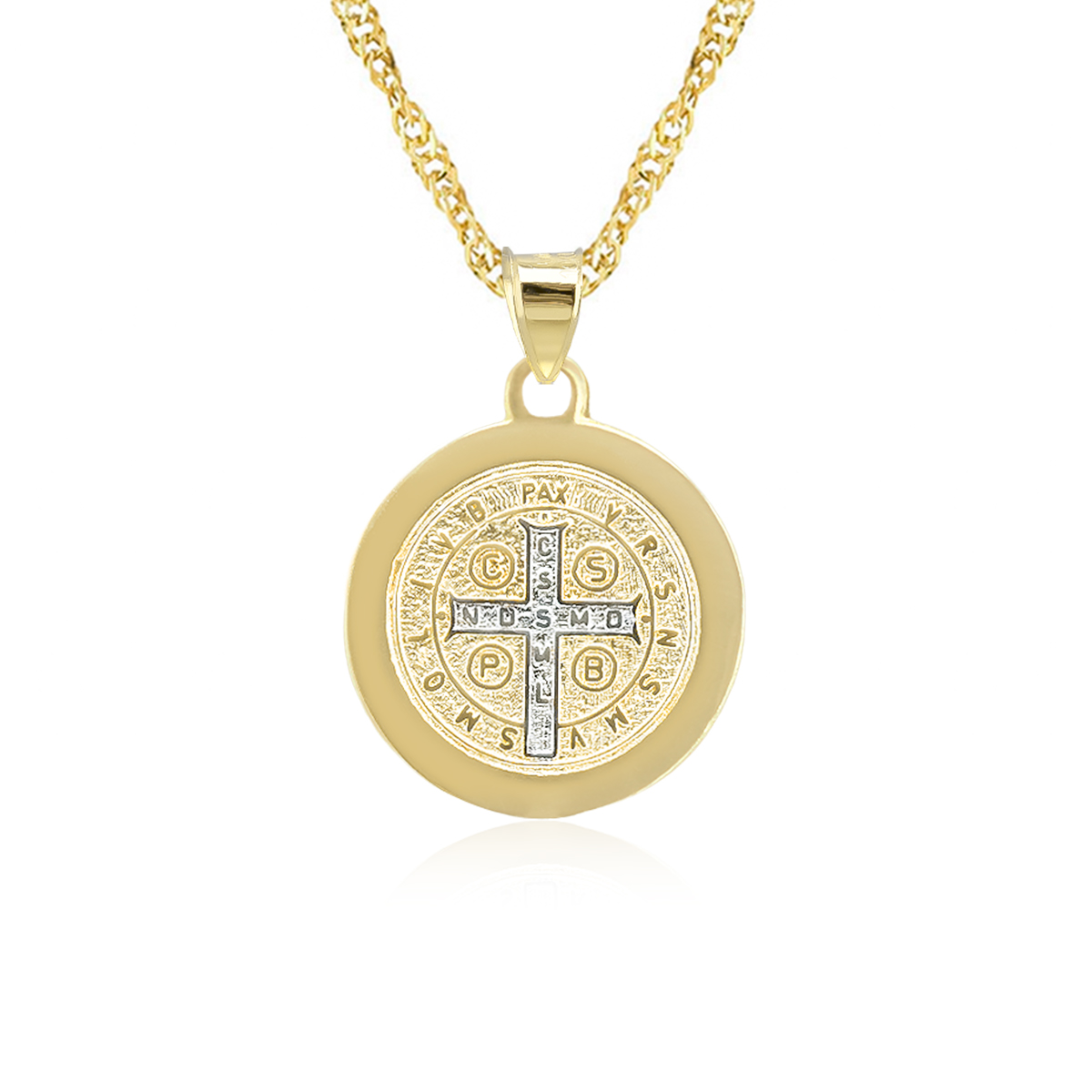 En el reverso se encuentra la tradicional cruz de San Benito junto con sus iniciales, reconocidas como un poderoso amuleto contra las malas influencias y protector ante cualquier adversidad.