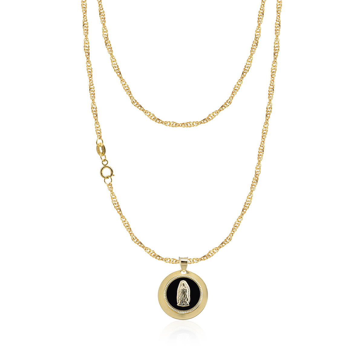 Devoción y elegancia se unen en esta Cadena con Dije Medalla Virgen de Guadalupe Oro 10k Ónix elaborada en oro de 10k con fondo de ónix negro. La silueta de la Virgen de Guadalupe irradia serenidad y guía espiritual, convirtiéndola en una pieza perfecta para quienes desean portar su fe con distinción.