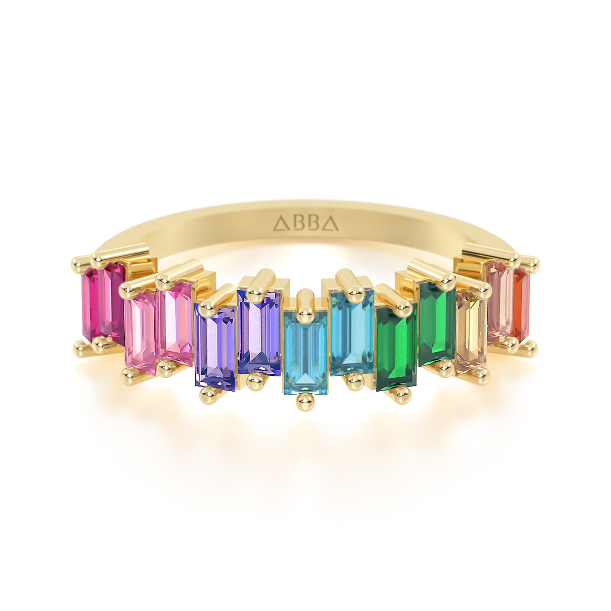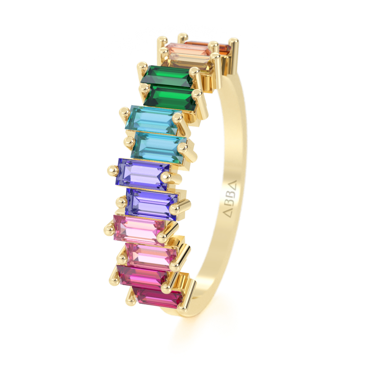 Deslumbrante Churumbela de Oro Eliza Baguette de diseño vanguardista que reinventa la elegancia clásica. Esta churumbela presenta gemas en corte baguette montadas en posición vertical, con un patrón asimétrico que aporta dinamismo y originalidad a la pieza.