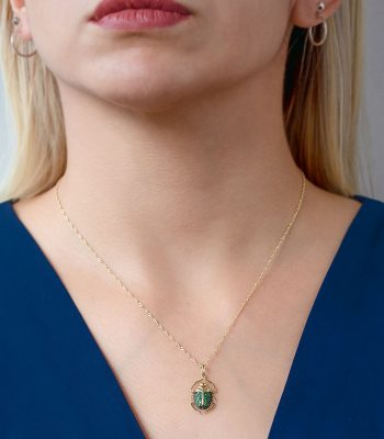 Magnífico Collar con Cadena y Dije de Escarabajo Egipcio Oro, esta joya es un amuleto de vida y poder, en la antigüedad se creía que el escarabajo representaba al Sol naciente, y era símbolo de la resurrección en la mitología egipcia.