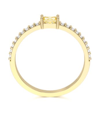 ¡Prepárate para deslumbrar con el Anillo de Compromiso Oro Zenit! Este anillo cautivador captura la belleza del universo con sus gemas que parecen reflejar las estrellas. Su gema central de corte princesa y las dos gemas redondas a los lados crean un diseño elegante y sofisticado que no pasará desapercibido.